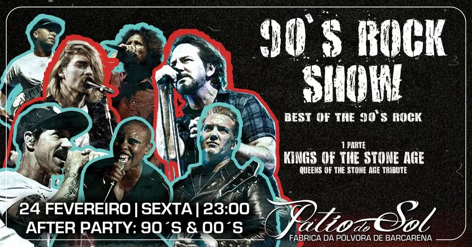 Em estreia no nosso palco um bandão com os grandes Hits rock dos 90´s como: Nirvana, Peral Jam, Skunk Anansie, Audioslave Foo Fighters Janes Addiction, Red Hot Sili Peppers, Blur, Rage Against The Machine, Marlin Manson entre outros. Na primeira parte o bandão Kings Of The Stone Age com as grandes malhas de Queens Of The Stone Age na voz de João Beato de Pearl Band. Após os concertos, na nossa pista, o DJ de serviço com os grandes hits dos 90´s & 00´s Concerto: 10€ com uma bebida de oferta (pressão). Jante ou então venha mais tarde apenas para o concerto. Não são necessárias reservas. Estas só serão necessárias caso queira também jantar: 919 585 803 (Concerto incluído)
