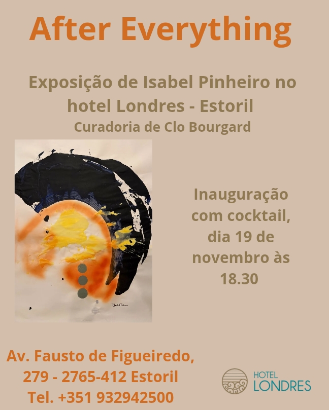 After everything A pintora Isabel Pinheiro vai mostrar a suas novas séries no Emblemático Hotel Londres no Estoril, uma Explosão de cor e movimento. + Adicionar ao Google Calendar + iCal / Outlook export Data 19 Nov 2025 Hora 18:30 Localização Hotel Londres Estoril / Cascais Av. Fausto de Figueiredo 279, 2765-412 Estoril Categorias Exposições Share this event EXPOSIÇÃO “ART OR NOT?” – Benedict Freeman Teatro Stand up Comedy Infantil Música Eventos Gratuitos Exposições Este Fim de semana