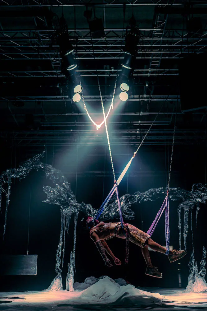 Em cena, dois corpos conduzem-nos por paisagens futuristas e pós-apocalípticas, explorando os percursos agridoces da migração entre o Sul e o Norte globais. Corpos que derretem, exaustos ou em êxtase, ao ritmo de um mundo em colapso. À sua volta, ecoam presenças fantasmáticas: vozes de demónios, locutores de rádio e fragmentos documentais que revelam os circuitos da migração – de pessoas, palavras e mercadorias.