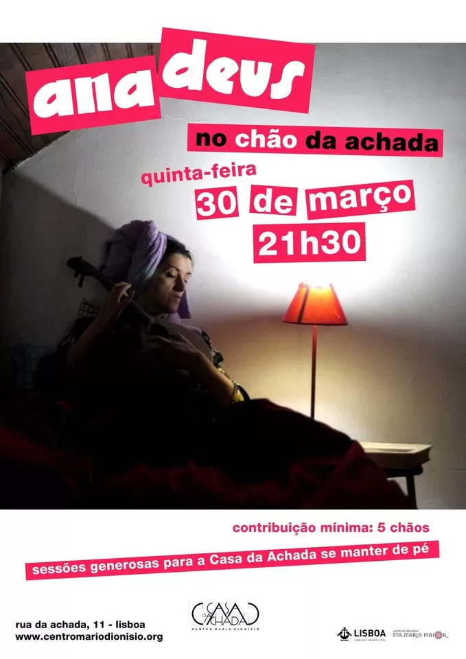 A Casa da Achada tem o prazer de anunciar que o seu chão será palco de uma generosa actuação da excepcional Ana Deus. O seu extraordinário percurso, que a levou a afastar-se progressivamente do institucional e do mercado e a entregar-se com liberdade e arrojo à exploração dos caminhos da voz, das palavras e da música, diz-nos que esta será uma noite de sentidos cheios.