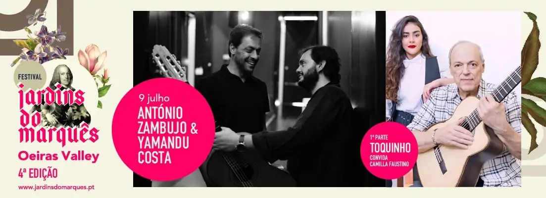 O Festival Jardins do Marquês – Oeiras Valley está de regresso em julho, para levar a magia da música junto aos jardins do Marquês, em Oeiras. Desde a primeira edição que celebra a melhor música cantada em português e a troca entre músicos lusófonos. Em 2024 não será diferente e a proposta para a noitede 9 de julho mostra isso mesmo: António Zambujo & Yamandu Costa, com uma primeira parte a cargo de Toquinho, que celebra 60 anos de carreira com a convidada Camilla Faustino.