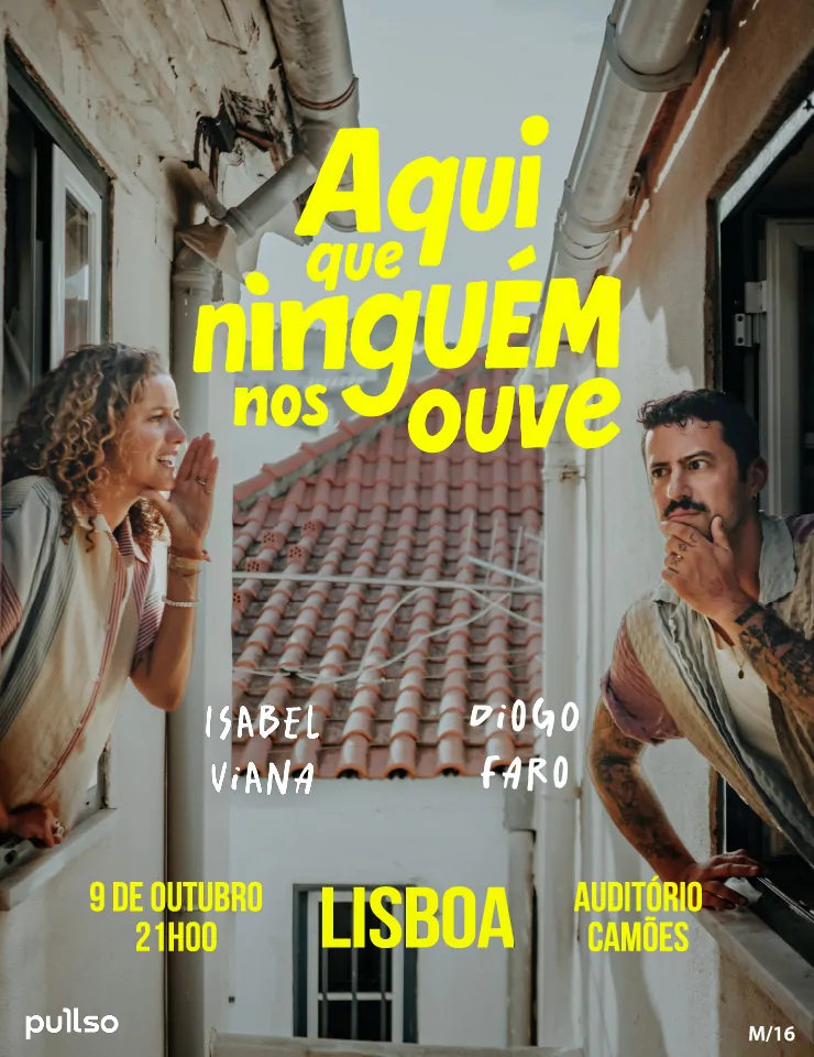 No dia 9 de outubro de 2025, às 21h00, Diogo Faro e Isabel Viana apresentam “Aqui Que Ninguém nos Ouve” no Auditório Camões, Lisboa, num espetáculo para maiores de 16 anos.