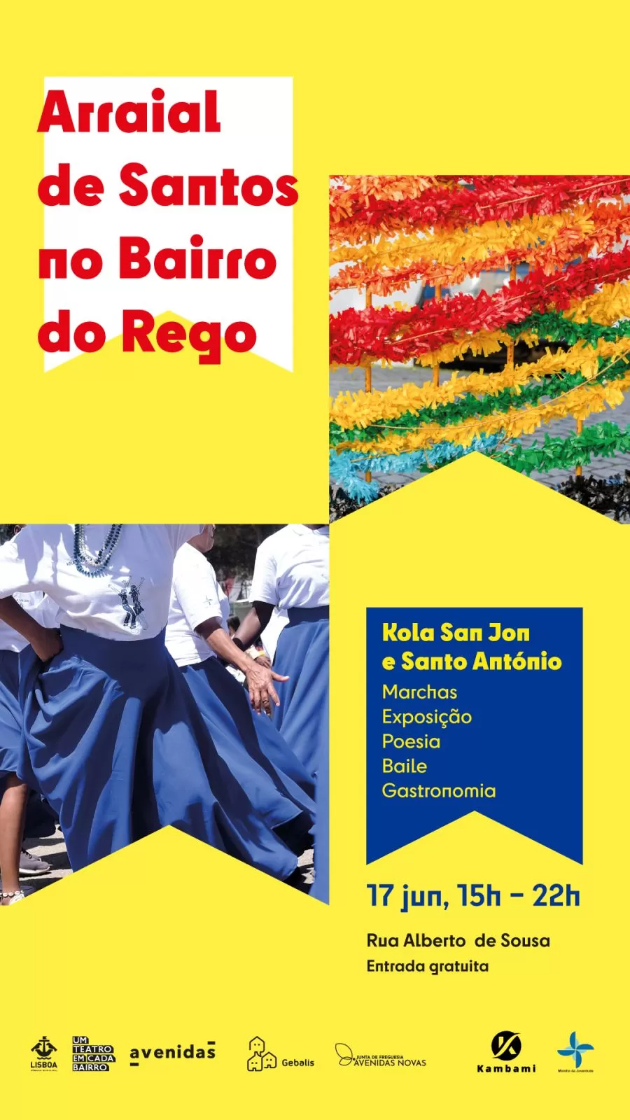 A Associação Kambami, convida-vos para o Arraial de santos no Bairro do Rego que se vai realizar no próximo dia 17 de Junho (Sábado) pelas 15:00 horas. Este evento será fantástico e será bastante enriquecedor culturalmente para todos nós, sendo assim uma tarde/noite memorável e diferenciada para todos os que estarão presentes. O evento contará com: Desfile Marchas – Kola San Jon, Escola MAL – *Mestre Arnaldo Louro de Almeida Visita à exposição Vulcões de Vento, Sol e Mar – Catarina Rosa Poesia Africana – Vera Furtado Degustação sabores de Cabo Verde – Cachupa & petiscos E acima de tudo, haverá muito convívio e muito intercâmbio cultural Evento totalmente gratuito ( o jantar também será totalmente gratuito) Contaremos com a vossa presença pois a Kambami é: Por ti… Por nós… Pela arte… E pela Cultura.
