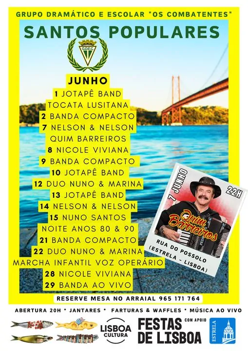 O Grupo Dramático e Escolar “Os Combatentes” apresenta o Arraial Santos Populares 2024 com uma programação repleta de música e animação durante todo o mês de junho. Confira as atrações confirmadas: