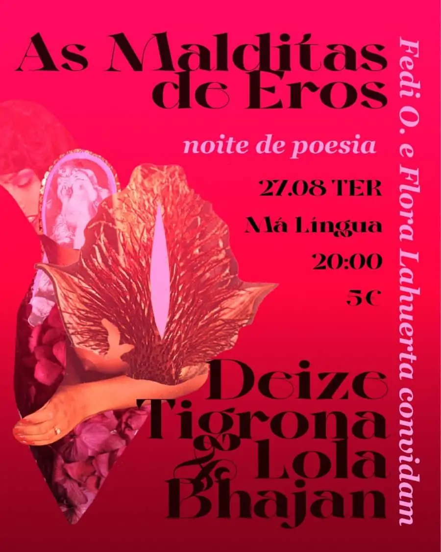 Nesta noite especial de tertúlia poética, as poetas Fedi O. e Flora Lahuerta recebem duas convidadas muito especiais: Deize Tigrona, pioneira do funk carioca, e Lola Bhajan, cantora, escritora e performer argentina. Será uma noite inesquecível, cheia de partilhas poéticas que exploram a lírica caliente, com textos safados, íntimos e inéditos em várias línguas e sotaques.