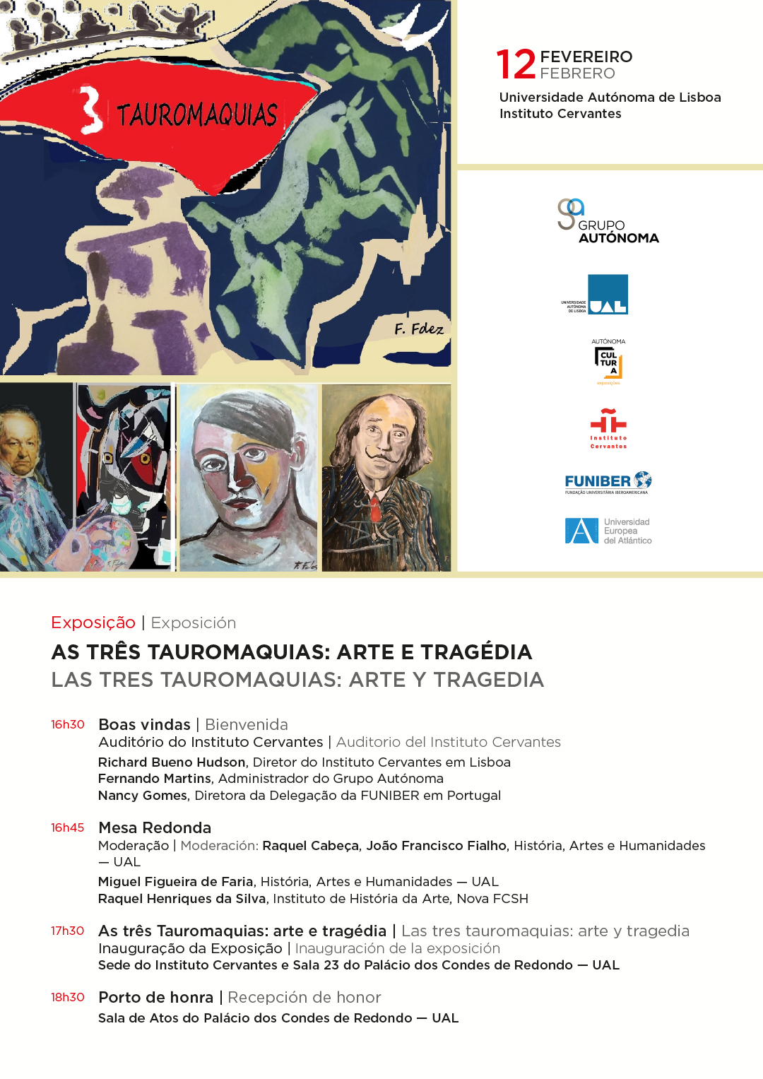 Sob o título As três Tauromaquias: arte e tragédia, a exposição reúne três coleções dos mais importantes pintores espanhóis, Francisco de Goya, Salvador Dalí e Pablo Picasso, integradas na Obra Cultural da Fundação Universitária Ibero-Americana (FUNIBER) e da Universidade Europeia do Atlântico (UNEATLANTICO), de Santander. Trata-se do segundo ciclo do projeto expositivo Arte além palácio rumo ao Cervantes: uma exposição, dois lugares, organizado em parceria pela FUNIBER, a Cooperativa do Ensino Universitário CEU/UAL, através da Autónoma Cultura, e o Instituto Cervantes de Lisboa.