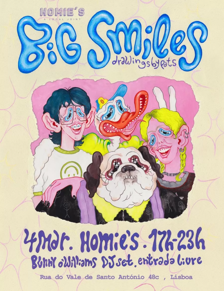Big Smiles é a primera exposição a solo da artista portuguesa Pats! @drawingsbypats tem uma necessidade de criar quase compulsiva. Inspirada em animação da Idade de Ouro americana e Underground Comix, ela povoou um mundo seu, cheio de cor, energia e grandes sorrisos. Apesar da sua alegre abordagem à criação, as suas obras matêm um nível de ansiedade que pode, por vezes, ser inquietante para alguns. Pats is a Portuguese Artist with an almost compulsory need to create. Inspired by Golden Age animation and Underground Comix, she has populated a world of her own full of Color, energy and big smiles. Despite her cheerful approach to creating there is a level of anxiety to her works that can, at times, be unsettling to some. + Trippy dj set by Bunny O’Williams
