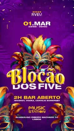 On March 1, Music Station will be the stage for an unforgettable Carnival experience! Blocão dos Five is the perfect event to celebrate Carnival in Lisbon, with the best vibes, music, and a lively atmosphere. Plus, the Promo Lot is already available for 15€, and those with the best costume will win a 50€ prize and a ticket for the next event!