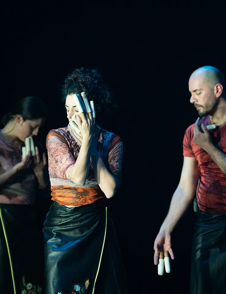 Em palco, três intérpretes fundem corpo, voz e som num ritual sensorial.