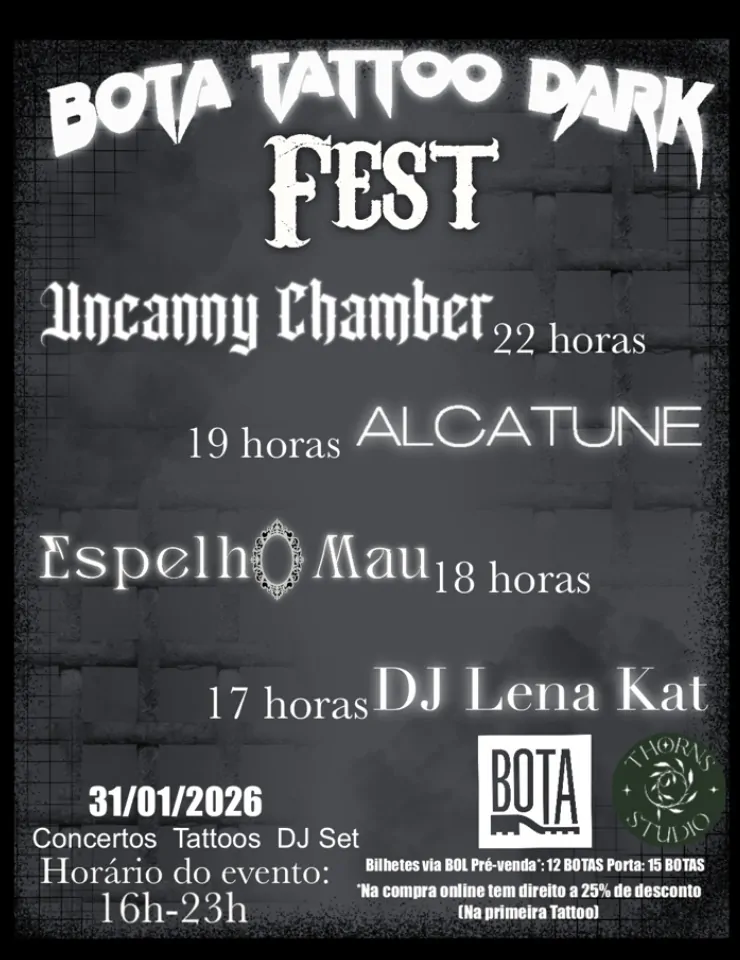 No dia 31 de janeiro de 2026, o Bota Tattoo Dark Fest promete uma imersão no universo da tatuagem, música e cultura alternativa no espaço BOTA, em Lisboa. Com mais de 7 horas de programação intensa, o festival reúne artistas, performances e experiências para os apaixonados pelo dark art e pela estética alternativa.
