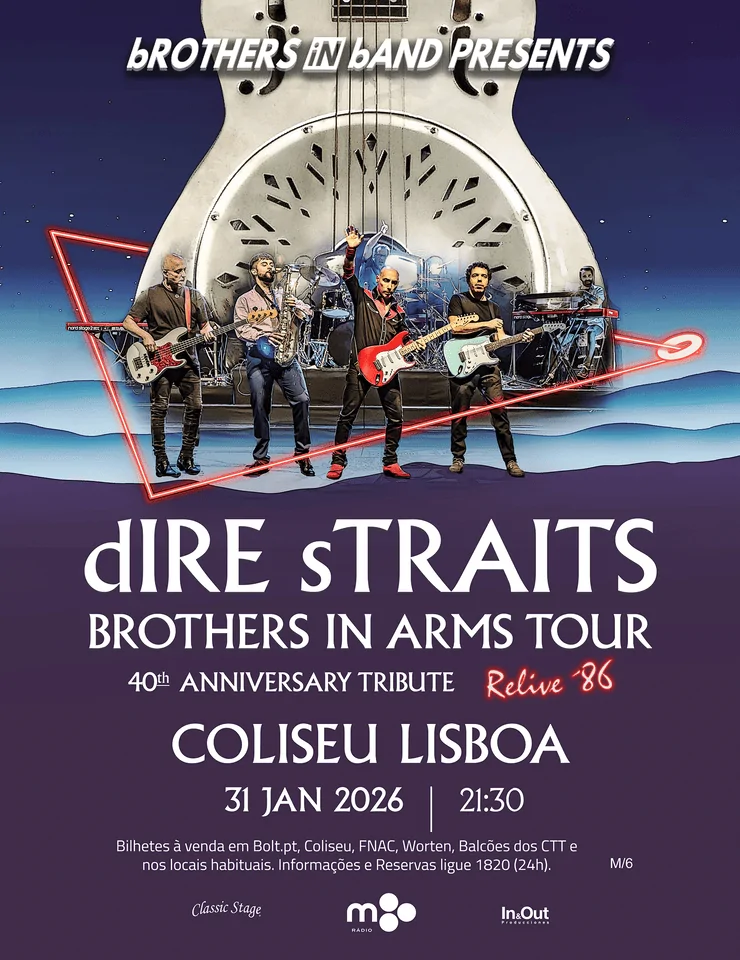Este espetáculo recria com fidelidade a histórica digressão de 1985-1986, celebrando quatro décadas do icónico álbum Brothers In Arms. Aclamado como o melhor tributo internacional aos dIRE sTRAITS, o concerto combina a mestria de Angelo Fumarola, que encarna a voz e a guitarra de Mark Knopfler, com uma banda de músicos de exceção, recriando a intensidade e a magia dos lendários concertos da banda britânica.