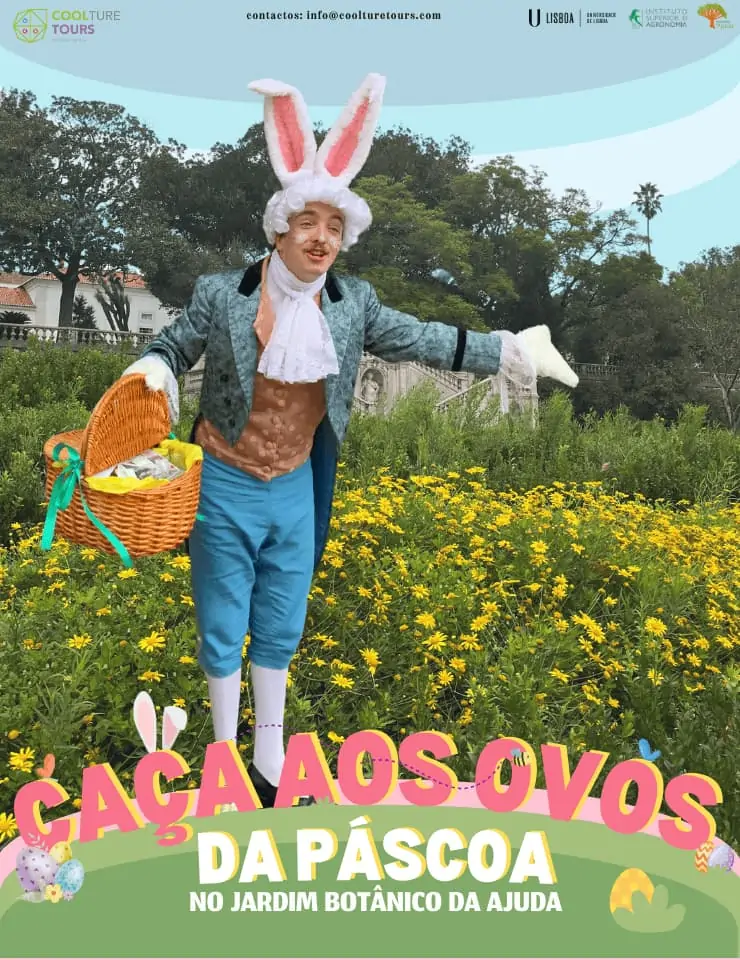 Celebre a Páscoa com a sua família numa experiência única no Jardim Botânico da Ajuda! Junte-se à Dona Cremilde, a nossa governanta simpática, e ao Coelho Janota, que irá guiar-vos numa caça aos ovos cheia de surpresas e mistério. Explore o Jardim Botânico da Ajuda, um dos mais antigos e belos de Portugal, enquanto aprende sobre a sua história e descobre os segredos que este espaço guarda. Passeie pelas suas alamedas rodeadas de árvores e plantas de todo o mundo, admire o impressionante Dragoeiro com mais de 400 anos e encante-se com a majestosa fonte das 40 bicas.