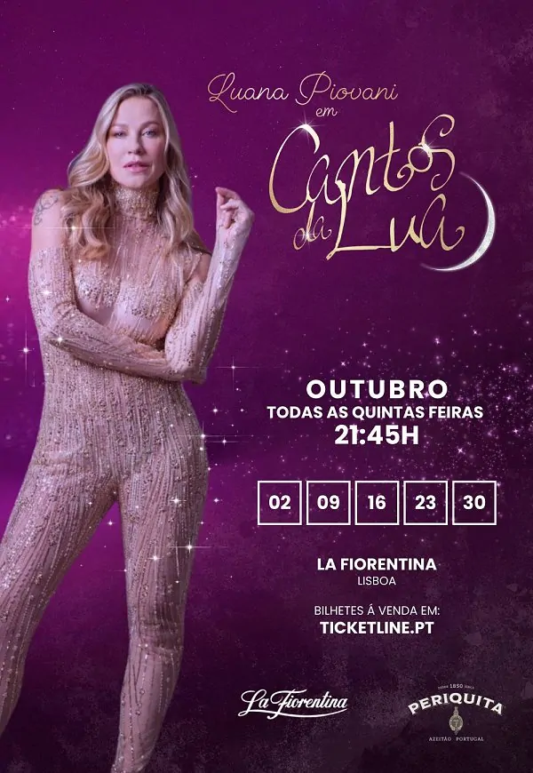 No mês de outubro de 2025, a renomada atriz brasileira Luana Piovani leva ao Restaurante La Fiorentina, em Lisboa, o espetáculo “Cantos da Lua”, celebrando 35 anos de carreira com uma mistura envolvente de teatro e música.