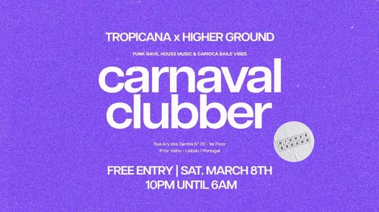 Fomos convidados pessoalmente pelo HIGHER GROUND para transformar o espaço em um verdadeiro baile de carnaval no estilo RIO DE JANEIRO, com as batidas dos DJs residentes da Tropicana, que acabaram de voltar de uma turnê pelo Brasil, além de um lineup de talentos locais lendários. E ainda tem mais! Vamos celebrar o Dia Internacional da Mulher E um ano de TROPICANA em Lisboa! 🎉