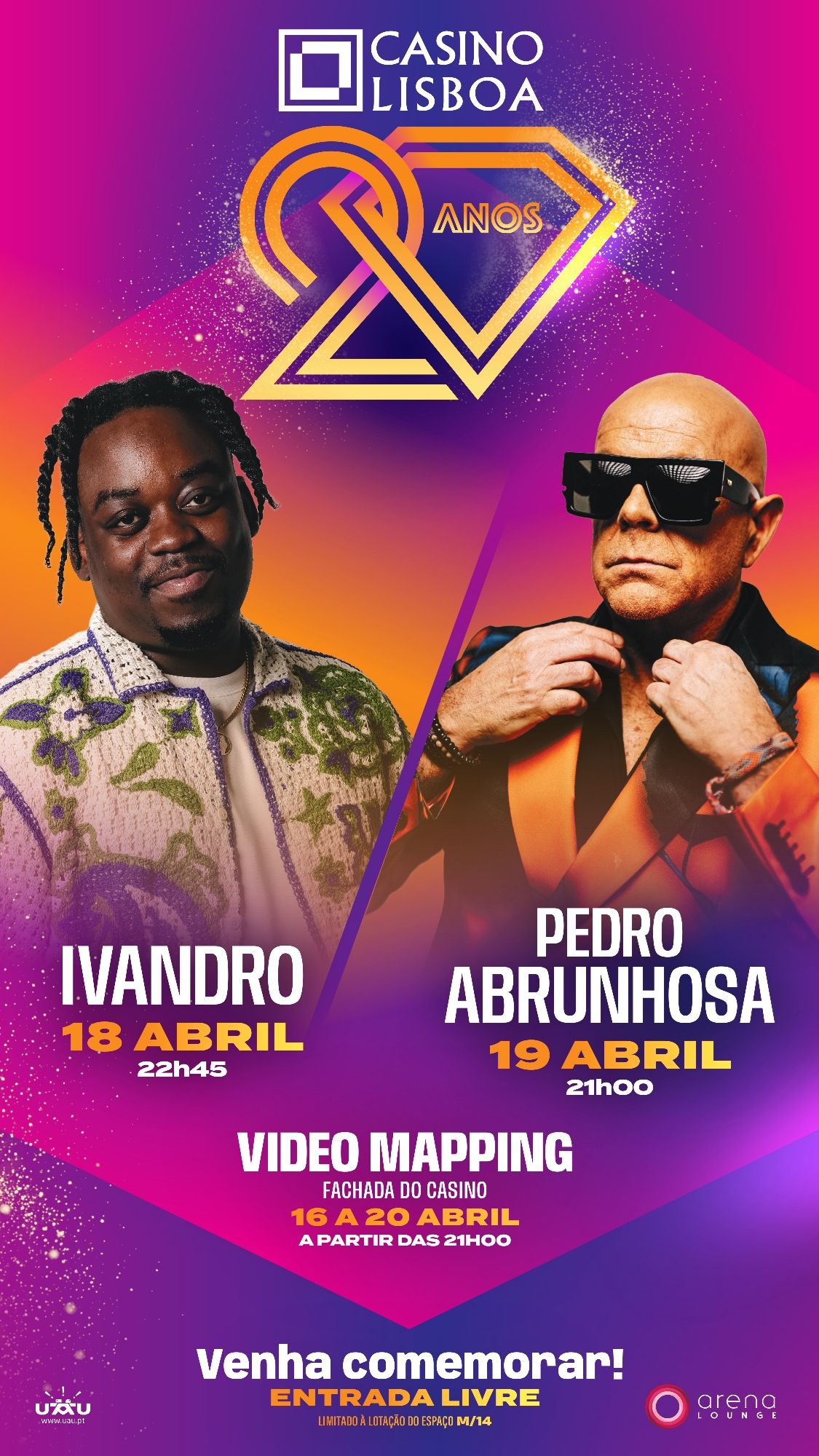 O Casino Lisboa celebra o 20º aniversário no próximo dia 19 de abril, oferecendo aos seus visitantes um surpreendente programa festivo. A comemoração que se prolonga por cinco dias, de 16 a 20 de abril, com a projecção de um vídeo mapping na fachada do edifício, inclui os concertos gratuitos da banda Voodoo Marmalade, de Ivandro e de Pedro Abrunhosa no Arena Lounge e a representação da peça “Dona Flor e Seus Dois Maridos” no Auditório dos Oceanos. A transmissão em directo, em ecrã gigante, no Arena Lounge do jogo de futebol Sporting x Benfica será outra proposta a não perder. Em destaque estará, também, uma campanha de jogo que oferece numerosos prémios, culminando com o sorteio de um automóvel Renault 5 E-Tech 100% eléctrico.