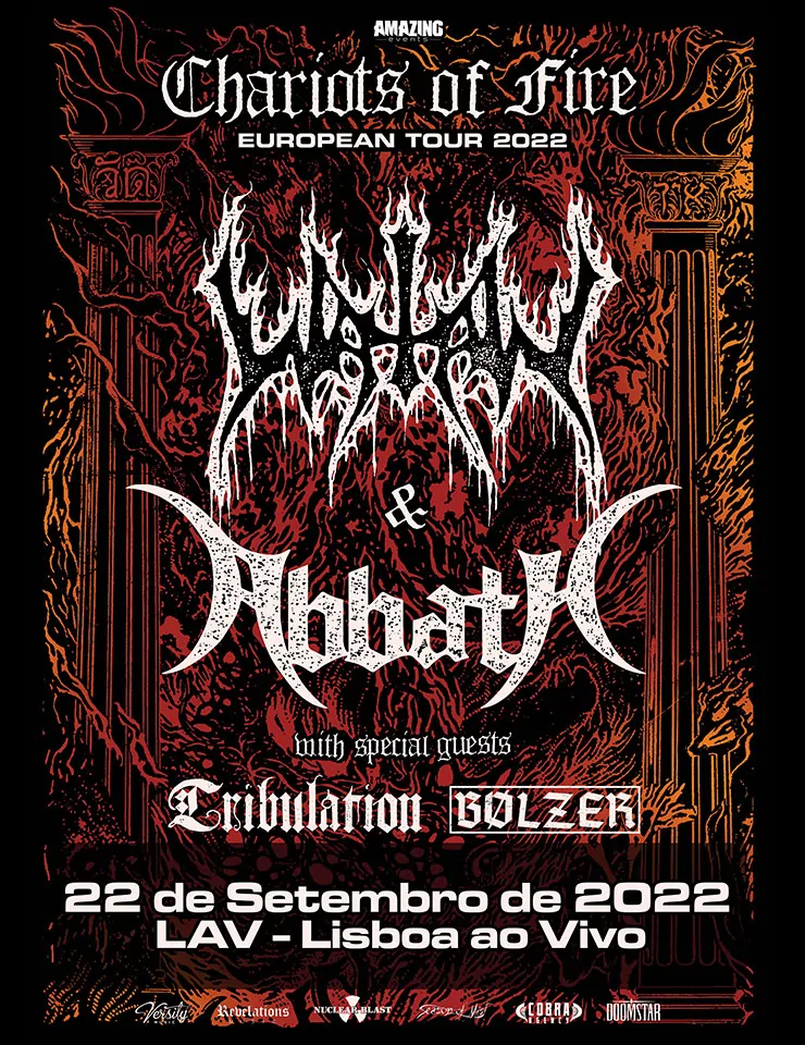 A Amazing Events orgulha-se de apresentar em Portugal a Chariots Of Fire Tour, que reúne no dia 22 de Setembro no LAV – Lisboa ao Vivo , as bandas WATAIN e ABBATH -Official- com duas bandas como convidados especiais os Tribulation (Official) e os BØLZER !