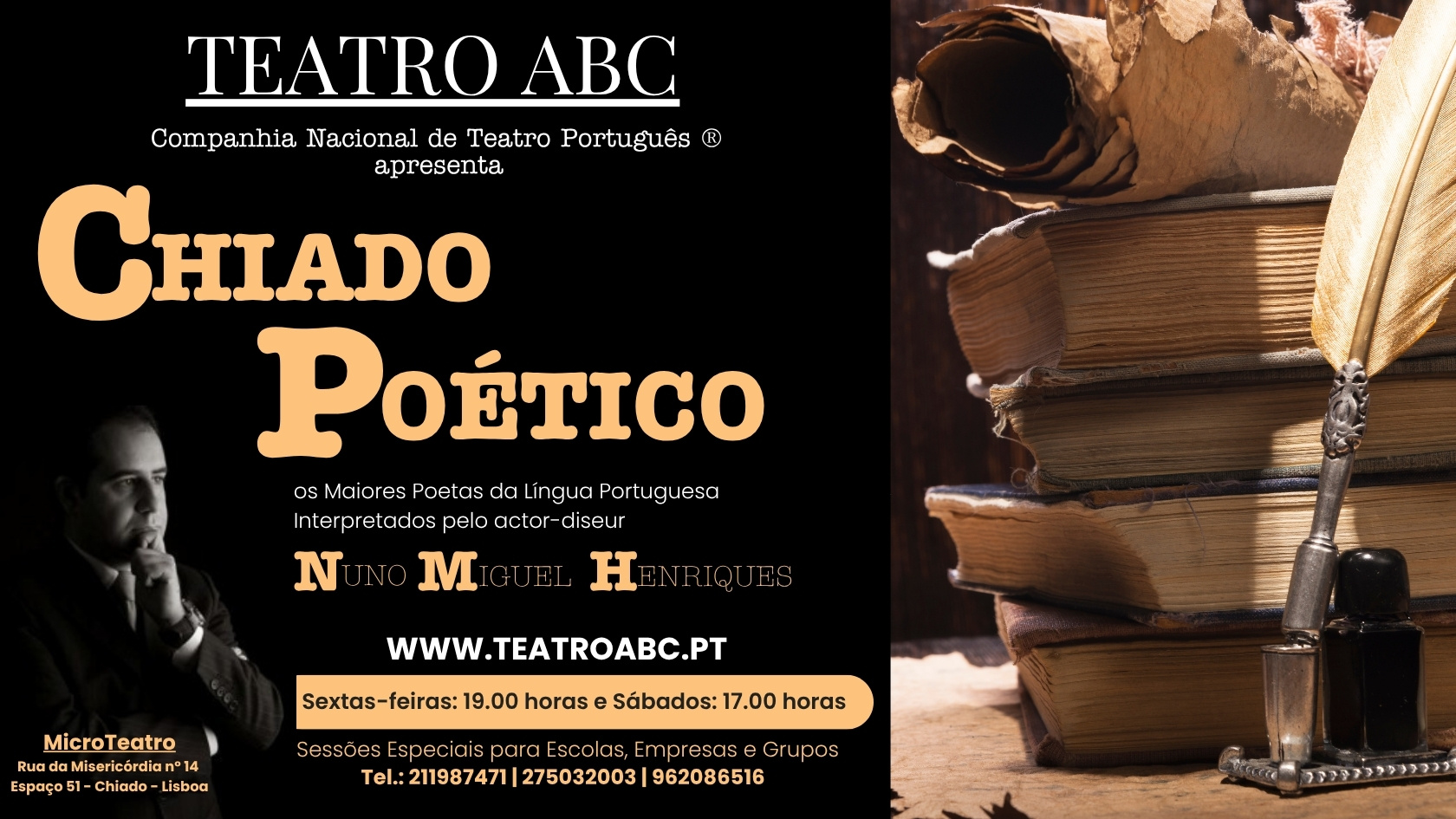 O actor Nuno Miguel Henriques apresenta todas as sextas-feiras pelas 19.00 horas e sábados pelas 17.00 horas o novo espectáculo teatral chamado “CHIADO POÉTICO” baseado em textos de grandes autores/poetas da língua portuguesa, com destaque para Fernando Pessoa, Luís de Camões, Florbela Espanca e muitos outros do imaginário da lusofonia literária, com a duração entre quarenta e cinco minutos a uma hora e apresentações também previstas em todo o país.
