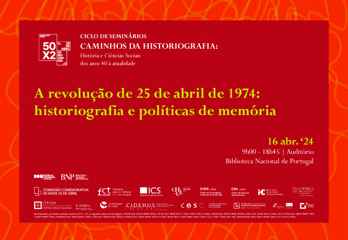 50 anos passados sobre o evento, somos desafiados a explorar as diferentes formas de construir, conservar, interpretar e mobilizar a sua memória, com uma atenção particular às contribuições historiográficas e, de maneira mais ampla, das humanidades e ciências sociais nesse processo. Entre a memória histórica afirmada em momentos de comemoração, a construção de arquivos e lugares de memória, a sua presença na criação cultural e na educação e a investigação e produção historiográfica, sociológica e das humanidades, este seminário constitui-se como um espaço de partilha, de debate e de discussão de orientações a seguir para a ampliação e aprofundamento do conhecimento histórico e científico-social sobre o 25 de Abril, a Revolução Portuguesa, a democratização e descolonização associadas a esse evento histórico e a construção da memória social e política do Portugal contemporâneo.