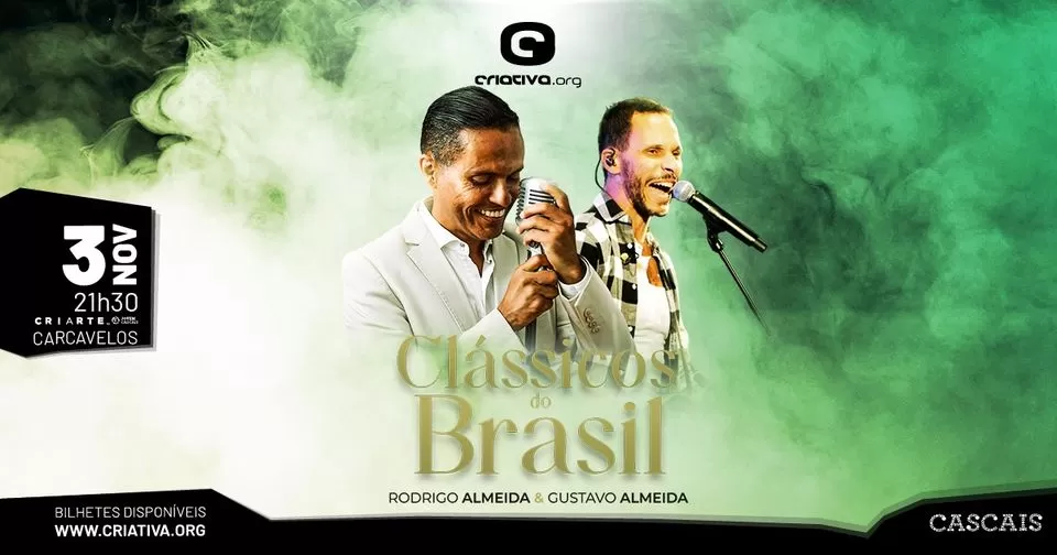 Com mais de 20 anos de carreira e centenas de concertos, RODRIGO ALMEIDA & GUSTAVO ALMEIDA apresentam “Clássicos do Brasil” em Portugal. Um espetáculo com músicas que marcaram os portugueses nos últimos 40 anos, incluindo artistas como Caetano, Djavan, Roberto Carlos, Tom Jobim e Netinho, que promete trazer alegria aos corações do público.