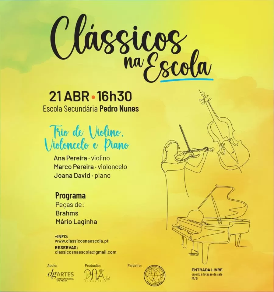 O projeto Clássicos na Escola é um projeto cultural apoiado pela Direção-Geral das Artes (DGARTES). Composto por 7 concertos de entrada livre entre Lisboa e Oeiras, que integra 27 artistas, leva a música clássica até às escolas com o grande objetivo de desenvolver o gosto pela cultura musical clássica em crianças e jovens. As visitas às escolas compreendem um ensaio geral exclusivo para alunos e comunidade escolar, a que se segue uma atuação aberta ao público em que os músicos tocam em duo, trio, quarteto ou quinteto, apresentando os mais variados instrumentos. Das cordas, ao piano, harpa, sopros e percussões, será feita uma viagem pela música clássica do século 18 à atualidade, comentada informalmente pelos próprios. O próximo concerto está marcado para o dia 21 de abril, às 16:30, na Escola Secundária Pedro Nunes.
