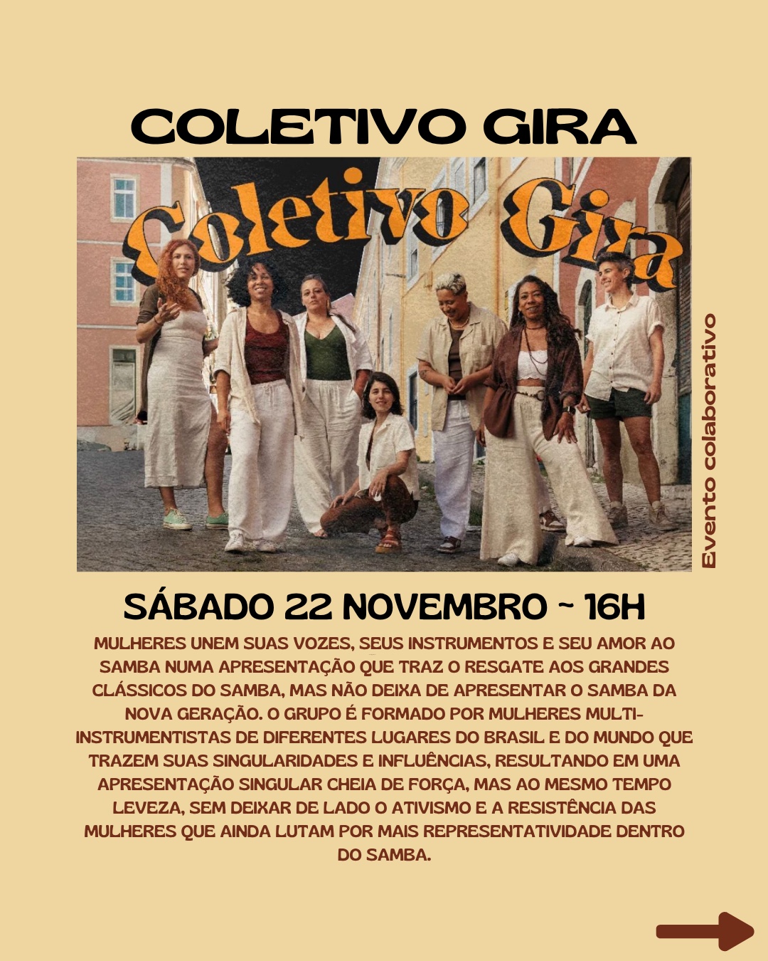 Mulheres unem suas vozes, seus instrumentos e seu amor ao samba numa apresentação que traz o resgate aos grandes clássicos do samba, mas não deixa de apresentar o samba da nova geração. O grupo é formado por mulheres multi-instrumentistas de diferentes lugares do Brasil e do mundo que trazem suas singularidades e influências, resultando em uma apresentação singular cheia de força, mas ao mesmo tempo leveza, sem deixar de lado o ativismo e a resistência das mulheres que ainda lutam por mais representatividade dentro do samba.