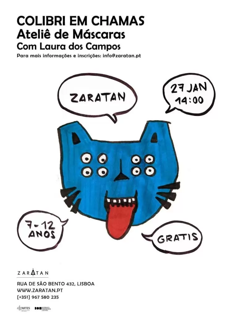 A partir do imaginário das peças da exposição “Colibri em Chamas” e da exploração do espaço da galeria da Zaratan, propomos aos mais novos um laboratório de criação de máscaras, dinamizado pela artista Oro Íris (Laura dos Campos). Após uma sessão de desenho às escuras, as mascaras são realizadas em 3D e coloridas utilizando materiais de fácil aquisição e manipulação.