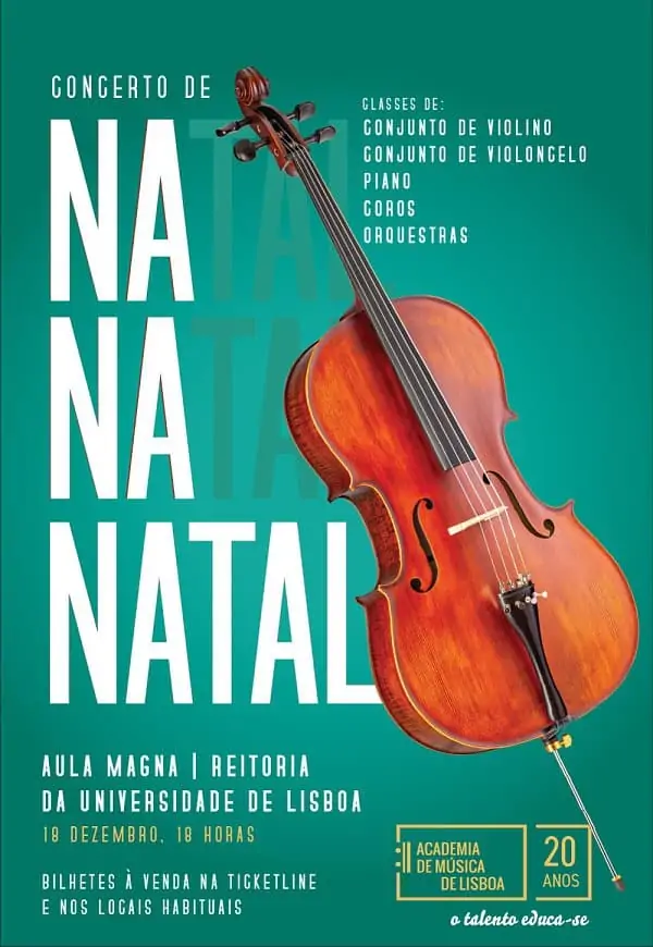Sob o lema “O talento educa-se”, a Academia de Música de Lisboa convida-o a celebrar o Natal com um concerto especial, que integra as comemorações do seu vigésimo aniversário. Este evento destaca o talento das crianças e jovens da academia, com apresentações das classes de conjunto de violino e violoncelo, coros e orquestras.