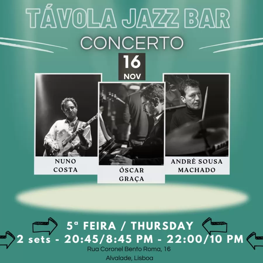 Concerto no Távola Jazz Bar Concerto no Távola Jazz Bar Nuno Costa – Guitarra Óscar Graça – Piano André Sousa Machado – Bateria + Adicionar ao Google Calendar + iCal / Outlook export Tags: jazzlisboa Data 16 Nov 2023 Desde Hora 20:00 Localização Távola Jazz Club R. Cel. Bento Roma n 16, 1700-177 Lisboa Categorias Concertos | Música Share this event Teatro Stand up Comedy Infantil Música Eventos Gratuitos Exposições Este Fim de semana