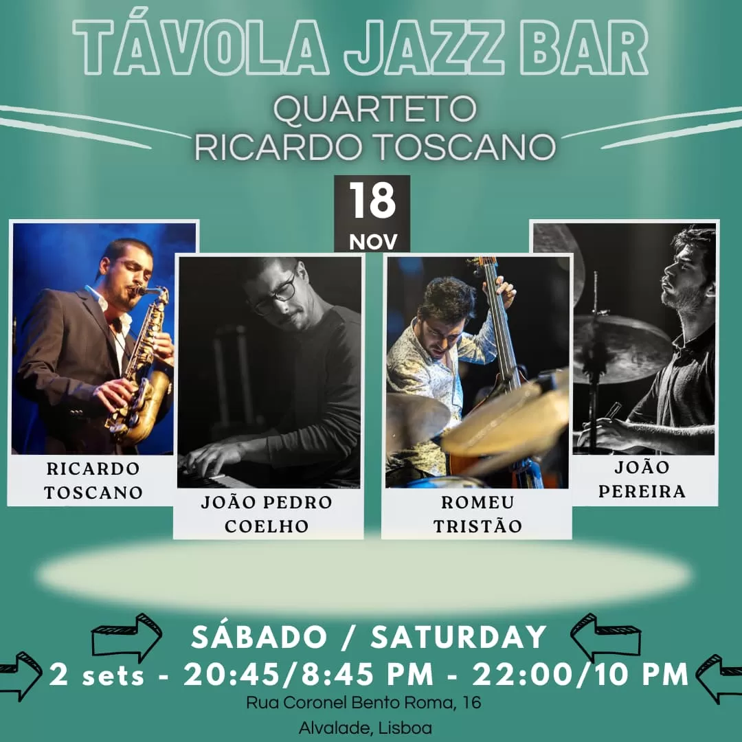 Concerto no Távola Jazz Bar – Quarteto Ricardo Toscano Concerto no Távola Jazz Bar – Quarteto Ricardo Toscano + Adicionar ao Google Calendar + iCal / Outlook export Tags: jazzlisboa Data 18 Nov 2023 Desde Hora 20:00 Localização Távola Jazz Club R. Cel. Bento Roma n 16, 1700-177 Lisboa Categorias Concertos | MúsicaEventos ao Fim de Semana Share this event EXPOSIÇÃO “ART OR NOT?” – Benedict Freeman Teatro Stand up Comedy Infantil Música Eventos Gratuitos Exposições Este Fim de semana