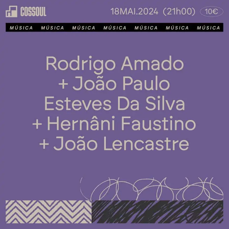 A Cossoul este sábado cede palco a um quarteto inédito, que tem a particularidade de juntar duas figuras de proa da cada vez mais dinâmica e internacional cena de vanguarda de Lisboa, eles são Rodrigo Amado (saxofone tenor) e Hernâni Faustino (contrabaixo), que irão actuar junto de dois dos mais versáteis músicos nacionais, João Paulo Esteves da Silva (piano) e João Lencastre (bateria). Este concerto promete uma complexidade musical de improviso orgânico mas com forte sentido composicional ao mesmo tempo, pois este vai-se construindo no decorrer da performance livre destes grandes artistas.