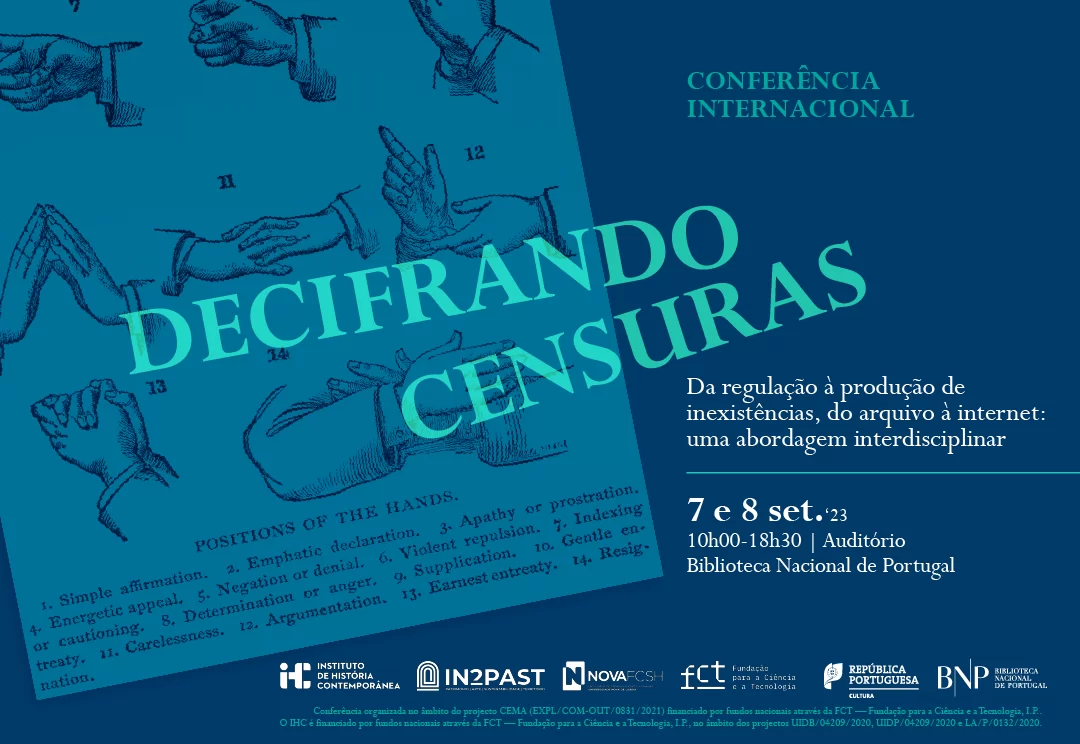 Conferência organizada no âmbito do projeto exploratório CEMA – Censura(s): um modelo analítico de processos censórios (EXPL/COM-OUT/0831/2021), desenvolvido no IHC na NOVA-FCSH e financiado por fundos nacionais através da FCT – Fundação para a Ciência e a Tecnologia, I.P. (https://ihc.fcsh.unl.pt/project/cema-projecto/).