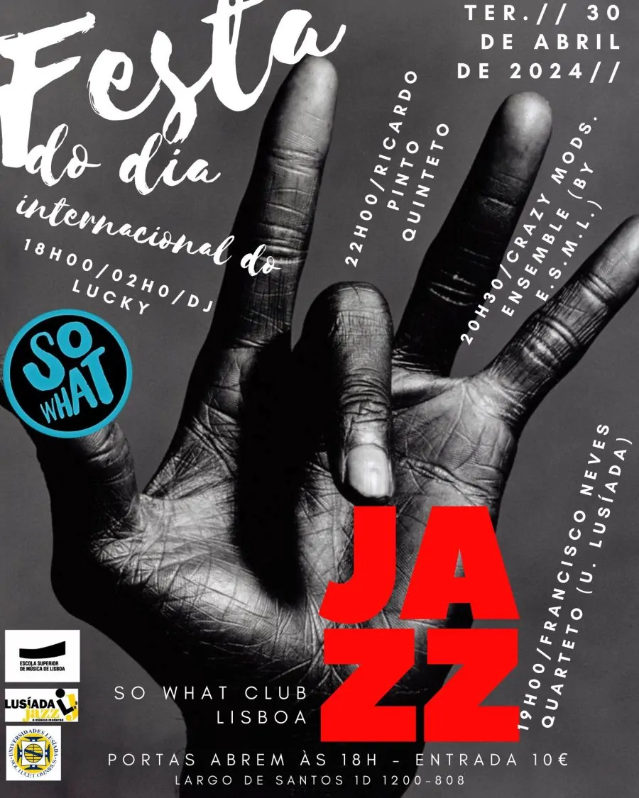 Além disso, desfrutem das performances das seguintes formações de bandas convidadas das duas principais instituições de ensino superior na área do jazz em Lisboa a Universidade Lusíada e a ESML ( escola superior de música de Lisboa ) . Francisco Neves Quarteto / 19h00 Francisco Neves – Guitarra Luís Cunha – Trompete Gonçalo Naia – Contrabaixo António Carvalho – Bateria Crazy Mods. Ensemble (by E.S.M.L.) / 20h30 Maria Fonseca (Trompete) Tomás Noronha (Saxofone Alto) Rodrigo Santos (Guitarra) Bruno Barbosa (Contrabaixo) Diogo Tomás (Bateria) Durante o evento, teremos conosco o incrível DJ Lucky para nos saudar com a sua excepcional escolha musical.