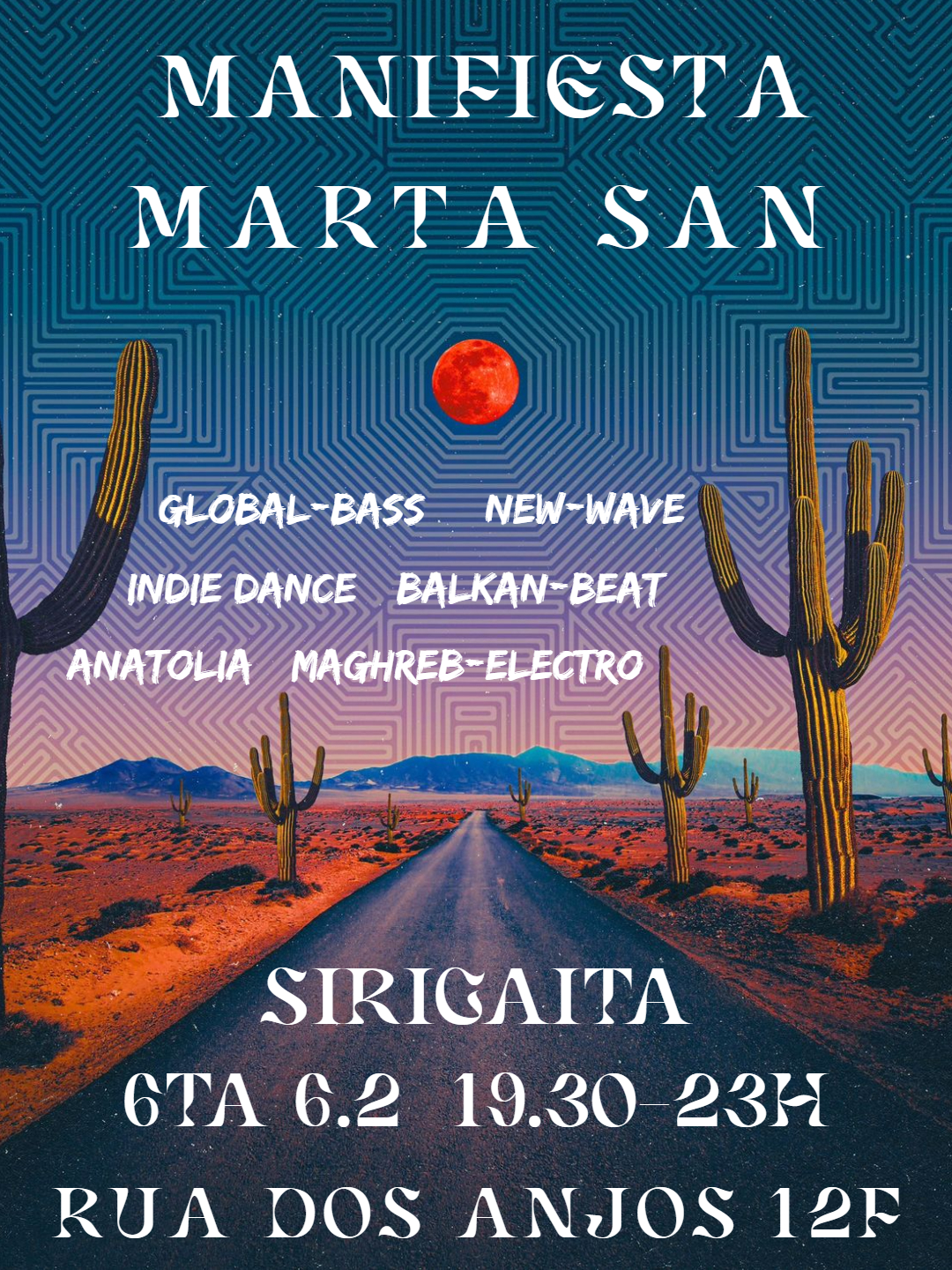(EN Below) Os caminhos cósmicos de Marta San e Manifiesta cruzam-se por uma noite apenas, para um soundclash sónico selvagem. Espera o inesperado: estas duas DJs mergulham fundo nas suas colecções numa viagem sonora em tapete mágico; de pérolas da Ásia Menor à Neo-Psicodelia, da new wave aos Balkan-Beats, da cumbia satânica à Electrónica Magrebe.
