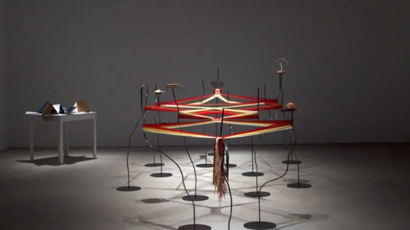 A artista Elina Waage Mikalsen (Noruega, 1992) apresenta uma instalação sonora em que som, couro e pequenas figuras funcionam como amuletos ou “histórias cosidas”. A obra explora ecos, repetição e o joik – canto tradicional – criando uma experiência imersiva que liga espaço, cultura e som.