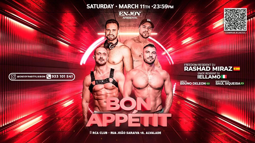 ENJOY BON APPÉTIT – RCA CLUB ENJOY BON APPÉTIT – RCA CLUB INTERNATIONAL ∙ LGBTQ+ ∙ ELECTRO ∙ HOUSE ∙ ELECTRONICA / DOWNTEMPO Bilhetes: https://xceed.me/pt/lisboa/event/enjoy-bon-appetit–119475/channel–enjoy-party?fbclid=IwAR2JcAxZNKA7AsNyXM6ZIP9BIcV5cREGL-0FowYn93conV5WHLqBEelwBjg ENJOY BON APPÉTIT – RCA CLUB + Adicionar ao Google Calendar + iCal / Outlook export Data 11 Mar 2023 Desde Hora 23:55 Comprar Bilhetes Localização RCA Club - LIsboa R. João Saraiva 18, 1700-249 Lisboa Website https://cartazculturallisboa.pt/agenda-rca-club-lisboa/ Categorias Clubbing | NightlifeConcertos | MúsicaEventos ao Fim de SemanaLGBTQI+ Share this event Teatro Stand up Comedy Infantil Música Eventos Gratuitos Exposições Este Fim de semana