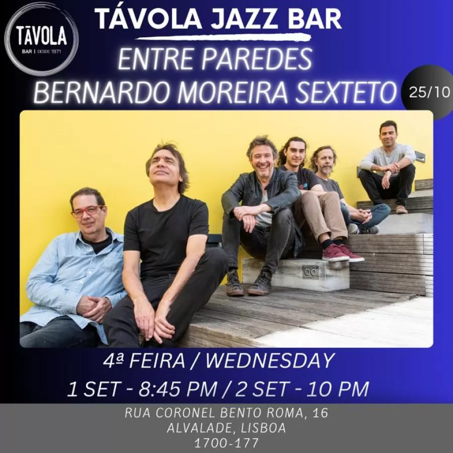 Concerto no Távola Jazz Bar – “Entre Paredes” com o Bernardo Moreira Sexteto Bernardo Moreira – Contrabaixo João Moreira – Trompete Tomás Marques – Saxofone alto e soprano Ricardo J. Dias – Piano Mário Delgado – Guitarra Joel Silva – Bateria
