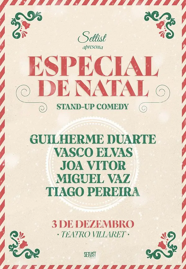 Neste final de ano, prepare-se para um Especial de Natal cheio de humor irreverente! A Setllist junta um elenco de comediantes para uma noite de stand-up comedy que vai dar um novo significado ao espírito natalício. Guilherme Duarte, Vasco Elvas, Miguel Vaz, João Vitor e Tiago Pereira prometem um espetáculo com piadas afiadas e imprevisíveis, oferecendo um presente antecipado muito melhor do que as tradicionais meias.