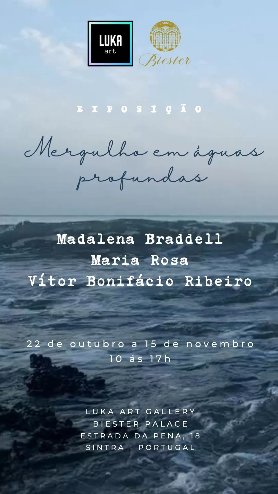A Luka Art Gallery abre os salões do Palácio Biester em uma homenagem ao Mar Português. Com uma perspectiva ao mesmo tempo que totalmente regional, ao apresentar 3 artistas de Sintra Madalena Bradel, Maria Rosa e Vitor Bonifácio, revela-se ao numa intenção de expansão, tal qual os grandes navegadores, mas agora com a arte desta pequena e mágica vila, que atravessa fronteiras e alcança o mundo sob a citação da literatura clássica portuguesa, que faz presença marcante em todo o conceito da exposição.