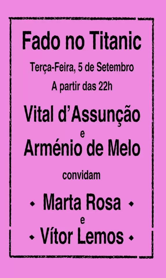 Fado com alma e sem peneiras regressa esta terça ao Titanic, com as guitarras de Vital d’Assunção e Arménio de Melo, e as vozes de Marta Rosa e Vítor Lemos. Entrada de 5 euros com direito a uma bebida.
