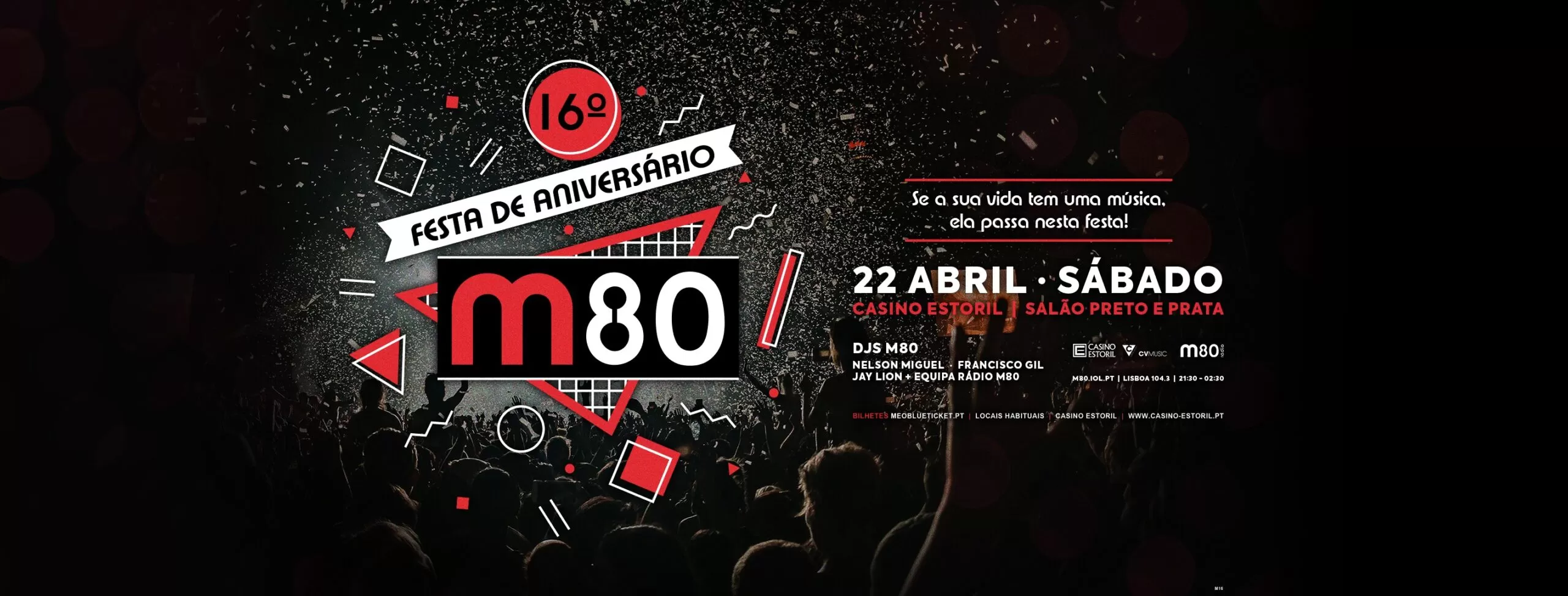 Depois do enorme sucesso da Tour dos 15 anos, as Festas M80 estão de volta para uma nova e incrível temporada. E tudo vai começar numa grande festa que assinala, e celebra, os 16 anos da M80! Na noite de 22 de abril, o Casino Estoril vai receber a equipa da M80, para uma grande festa e uma fantástica emissão de rádio onde todos os pormenores vão ser contados para os milhares de ouvintes que, de uma ponta à outra do país, vão também celebrar o aniversário da sua rádio, acompanhando esta emissão especial. E este vai ser o pontapé-de-saída da nova Tour de Festas M80 que vai contar com mais surpresas, divertimento e muita música…a música que só os DJ’s da M80 sabem combinar, para tornar as noites das Festas M80 únicas e irrepetíveis!