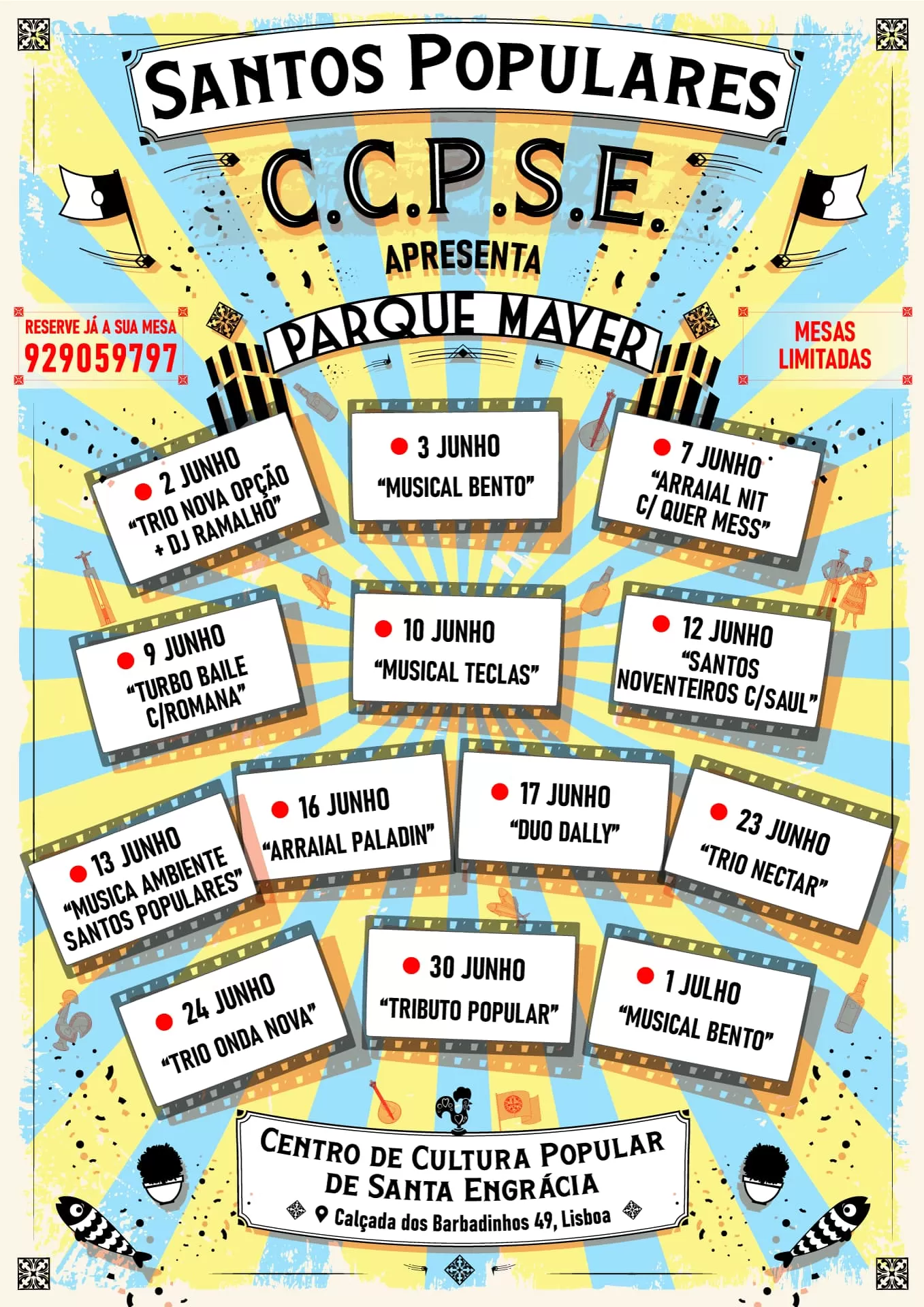Arraiais Populares em parceria com a Câmara Municipal de Lisboa nos dias 2,3,4,7,9,10, 12,13,16,17,23,24,30 de junho e 1 de Julho, ou seja, todas as sextas, sábados e vésperas de feriado.