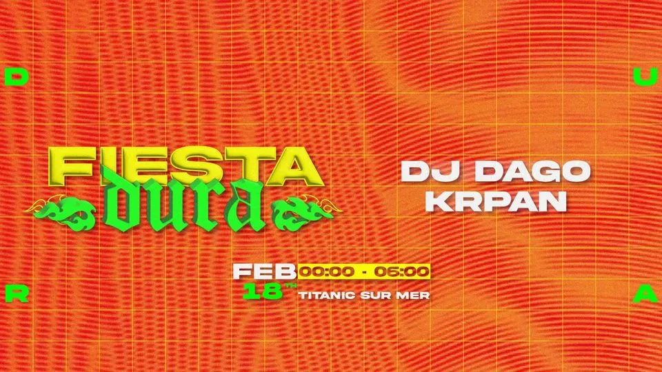 Fiesta Dura é a receita da melhor música com o calor da melhor pista, deixando o dj explorar todo o tipo de balanços que bem entender! Esta festa vai oferecer uma experiência muito mais que dançar, além dos DJs de topo, prontos para não te fazer parar um segundo, a FIESTA DURA oferece uma experiência visual e sensorial que te vai fazer viajar para uma realidade onde vais querer estar perreando!