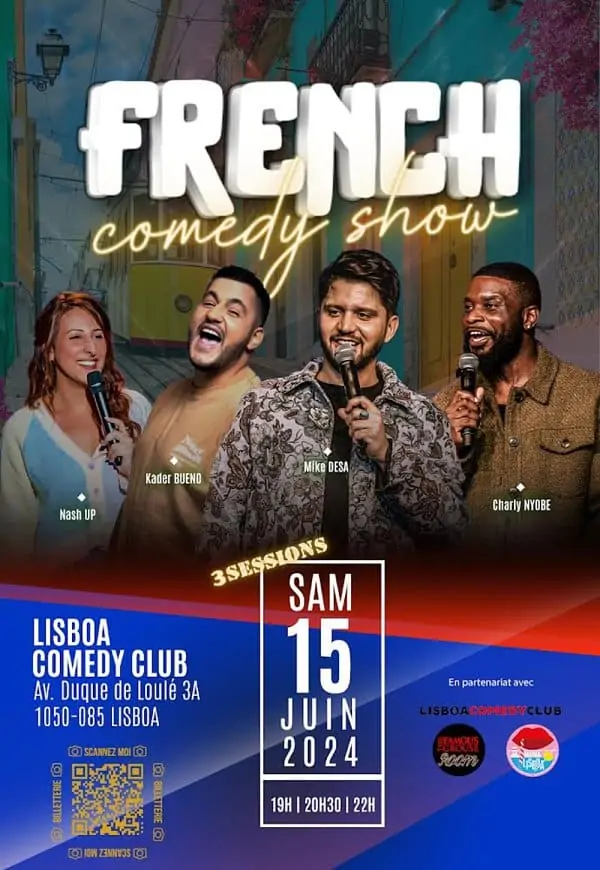 Descrição: Venha compartilhar um show de stand up 100% francês com 4 humoristas renomados: Mike Desa, Charly Niobe, Kader Bueno e Nash! Deixe-se levar por 1 hora de imersão total na cultura e no humor franceses.