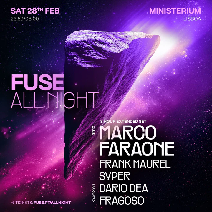 A festa Fuse All Night regressa a Lisboa com uma noite épica no Ministerium Club, prometendo música eletrónica de qualidade e energia do início ao fim. Esta edição recebe o aclamado DJ Marco Faraone, acompanhado por Frank Maurel, Dario Dea e Fragoso, garantindo uma experiência intensa para todos os amantes de techno e house.
