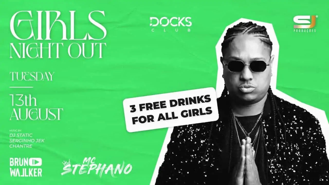 Descrição: Terça-feira é noite de festa na discoteca The Dock’s Club com uma oferta especial para as mulheres. Todas as garotas receberão 3 bebidas gratuitas e acesso ao open bar até 1:30 da manhã.