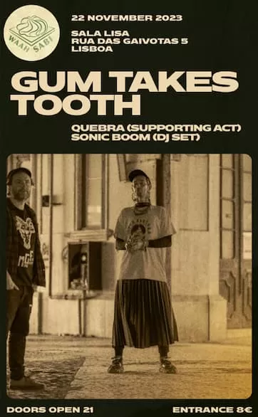 Tickets: 8 EUR at the door or via https://dice.fm/event/7b689-gum-takes-tooth-quebra-sonic-boom-dj-set-22nd-nov-sala-lisa-lisbon-tickets