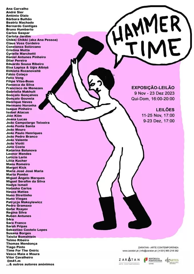 “Hammer Time” is an art show and a performative event that aims to engender a micro-investigation about the value of the work of art from a peripheral position in relation to the market. At the same time, “Hammer Time” is a fundraising event, whose revenues support both participating artists and the sustainability activity of the artist-run space Zaratan. The participation in the event was open to all, invited to submit applications, and the selection process brought together more than 70 works from national and international artists. The contemporary art system is articulated in structures and circuits of production, circulation, sale and dissemnation, in which various actors play roles of synergy or antagonism. By pantomimeing the structure of the auction [as a market institution characterized by an explicit set of rules], Zaratan [as an independent space] seeks to test possible alternative accesses to the so-called commercial art world, but always presenting challenging work and without giving in to trends and the fashions of official circuits. Moreover, the analysis of the connection between the aesthetic value and the economic value of a work is crucial to understand the general meaning of artistic production as a phenomenon peculiar to the culture or subculture in which we live. The value of a work of art, considered only from the point of view of the person who loves, owns it or wants to possess it, is immeasurable. As the aesthetic value cannot be completely objectified or quantified, a work has value as long as it can be publicly appreciated, that is, it needs a public space where the sharing of form evaluations can take place. The institutional channels of art – museums, galleries, foundations – used to provide this function, and still do so to some extent when they are not corrupted by individuals who manipulate art only as an investment. The current money system turned several of the great institutions of public culture into a promotion and commercialization circus, forgetting the value of the connection between public and artistic creativity. Responding to the absence of alternative modes of production and cultural sustainability, Zaratan intends to become such a space for discussion and involve collective participation in order to instigate a public debate, in the form of an auction, on the valorization of contemporary aesthetic production. “Hammer Time” will also be accompanied by a series of 4 performance biddings conducted [live and in digital simultaneously] by an auctioneer invited by Zaratan: the artist João Pedro Branco. The exhibition and paralel event integrates the program of Lisbon Art Weekend, happening on November 9-10-11-12 with extended opening hours (12:00-20:00). https://www.lisbonartweekend.com/