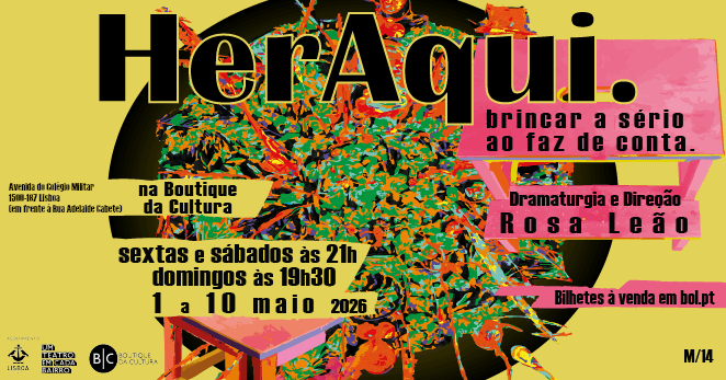HerAqui. é uma viagem contada em 23 contos. O espetáculo propõe uma abordagem de descoberta e liberdade, interpretada por muitas pessoas, com mais ou menos experiência em palco. É feito por e para pessoas com vontade de fazer teatro.
