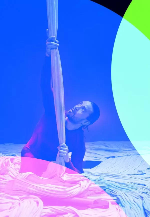 Jefta van Dinther é um coreógrafo que quase sempre dialoga com interessantíssimos mecanismos cénicos, cabos, roldanas, telas e, neste caso, uma enorme faixa de tecido que, inexoravelmente, é puxada para cima, como uma montanha que se eleva para um céu redentor, o que define e condiciona toda a composição coreográfica.