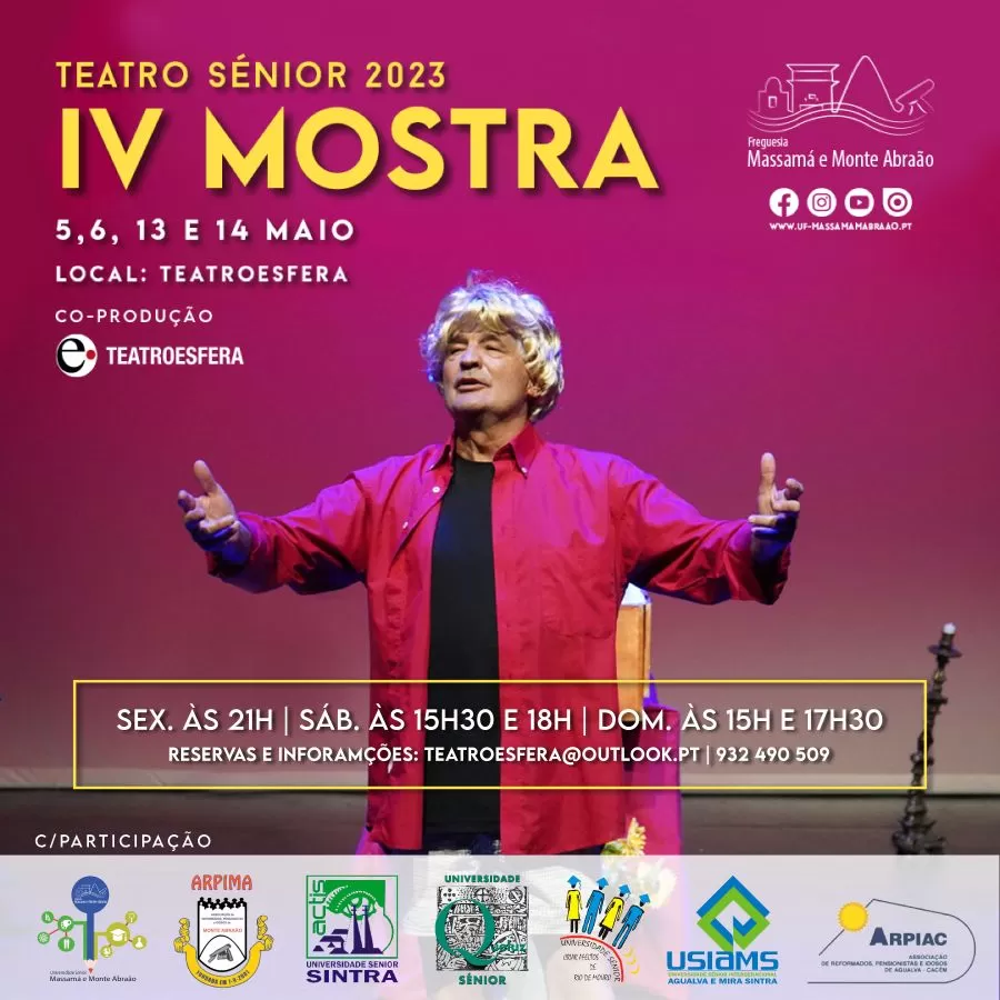 Conheça a programação: 5 de maio – às 21h00 – USCARM | Grupo Sempre em Festa – Peça Festa em Vida 6 de maio – às 15h30 – ARPIAC | Grupo de Teatro os Avós – Peça Gritando – às 18h00 – ACTIS | Grupo de Teatro ACTIS – Peça Ensaio 13 de maio – às 15h30 – UNIQUE | Grupo de Teatro da EUNIQUE – Peça Recordar é viver – às 18h00 – USIASMS | Clube de Teatro – Peça Um paço em frente 14 de maio – às 15h00 – ARPIMA | Grupo de Teatro ARPIMA – Peça Jardim das Tretas – às 17h30 – USMMA |